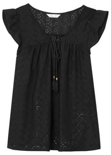 SPRINGFIELD T-Shirt mit V-Ausschnitt, Rüschen an den Ärmeln und Schnürung aus Baumwolle, Schweizer Stickerei, Damennaht, Standardschwarz, X-Small Report This